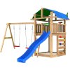 Utrustning som ingår: Stege, Rock Module med 5 klätterstenar, ratt, kikare, Jungle Gym-flagga, blå rutschkana (265 cm) med möjlighet att ansluta till trädgårdsslang, sandlåda, Climb Module med klättervägg och klätternät, 2 gungstolar med slitstarkt polyesterrep