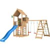 Utrustning som ingår: Stege, Rock Module med 5 klätterstenar, ratt, kikare, Jungle Gym-flagga, blå rutschkana (265 cm) med möjlighet att ansluta trädgårdsslang, sandlåda, 120 kg certifierad sandlådesand (6 påsar à 20 kg), 2 Climb Modules med klättervägg och klätternät, 2 gungstolar med slitstarkt polyesterrep, trätak