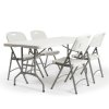 Setet består av ett fällbord med måtten H74 x B76 x L183 cm och 6 st klappstolar med måtten H87 x B47 x D57 cm. Sitthöjd på 47 cm. Setet är enkelt att rengöra och i stort sett underhållsfritt. Den låga vikten på möblerna betyder att det är lätt att arrangera dom för olika evenemang och naturligtvis är det lika lätt att packa undan dom igen. Det går att köpa till transport- och lagringsvagn för såväl stolar som bord.